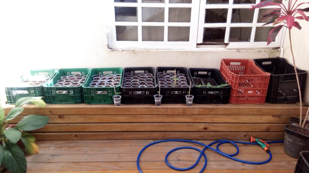A saber, esta horta é especializada em produzir para pequenos espaços. Os participantes produzem parte da horta ali e, depois, levam e cuidam em casa da outra parte.